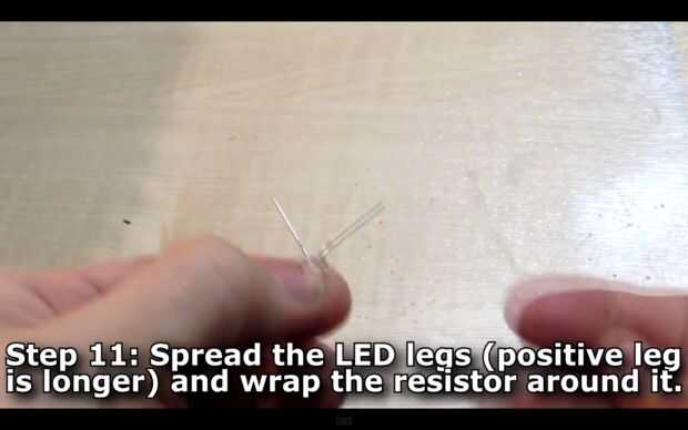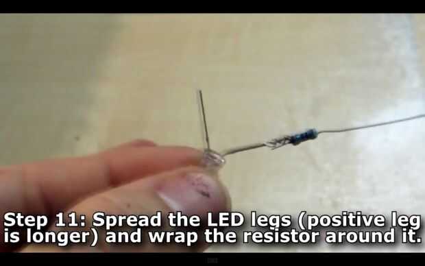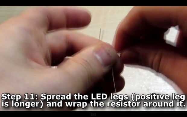 Envuelva una pierna de resistencia alrededor de la pierna larga y positivo de cada LED.