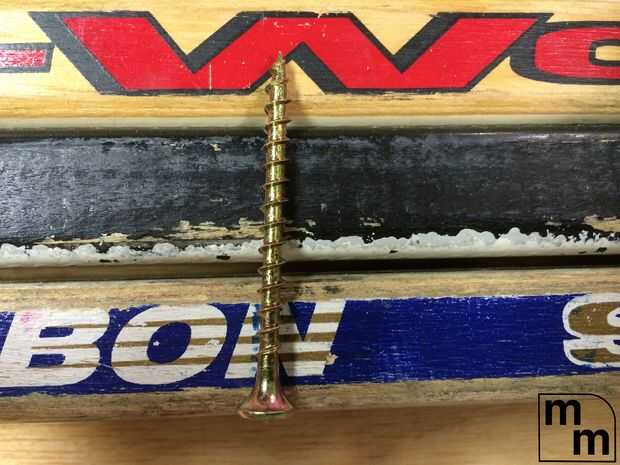 Introduzca un tornillo exterior de 2" #10 en cada agujero. Es importante que la cabeza del tornillo es contador hundido en el lado de los palillos (para que todos los palillos estén apretados uno contra el otro). Puede lograr fregadero contrario la cabeza del tornillo 1) usando un poco de fregadero mostrador para asegurar la cabeza del tornillo cónico es capaz de sentarse a ras con el lado de la palanca o 2) (Nota Esto es un poco de un hack) sólo conducir el tornillo con una pistola por lo que se comprime firmemente que esté al ras con la cara del palo.