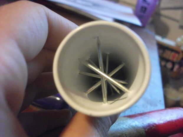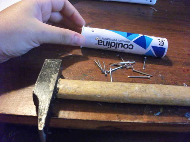 Tomar un tubo de (en este caso) Couldina (ahora es cuando la empresa me paga una Comisión publicidad gratis!). Luego Martille clavos todo el tubo. He hecho en forma de espiral dejando 1cm entre clavos. Debe martillo los clavos rectos.