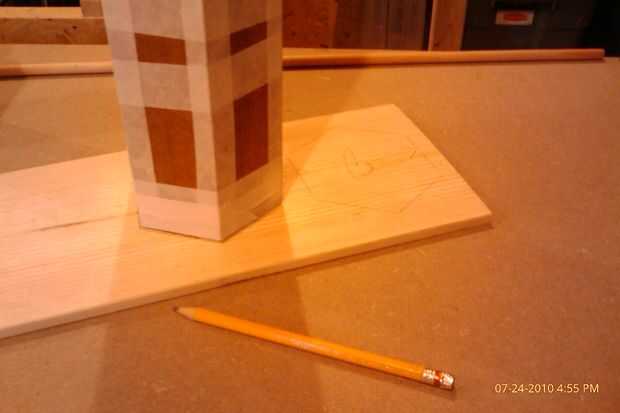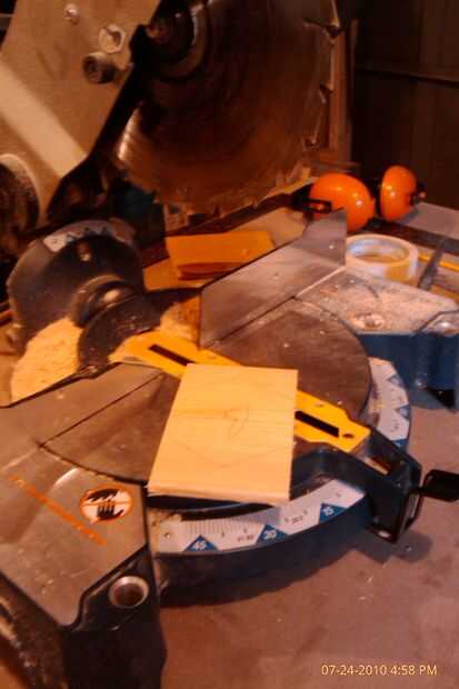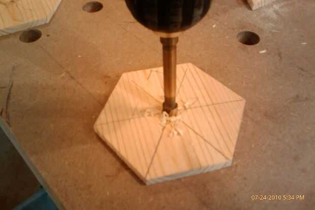 Una vez que se cortan ambos extremos, encontrar el centro de las piezas y taladre un orificio del tamaño de la espiga de madera que utilizará para el proyecto. Usé un poco Fostner para hacer el hoyo y dejó aproximadamente 1/16" antes que el otro lado por lo que no vemos la espiga madera terminada el palo de lluvia.