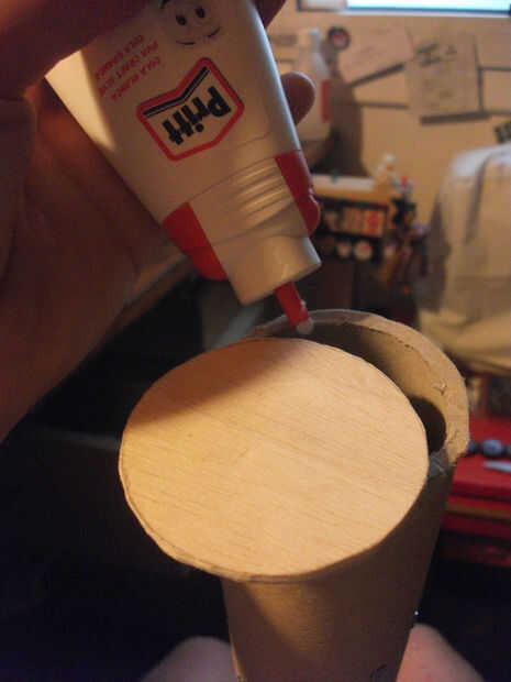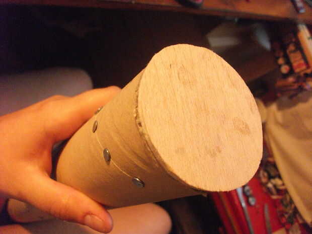Ahora necesitas algo para cerrar el tubo. Cortar dos círculos de madera con una dremel, pero nada funciona. Elegí madera porque resuena incrementando el sonido (mi suegro tenía la idea). UNO de los cercles del tubo pegué con cola blanca.