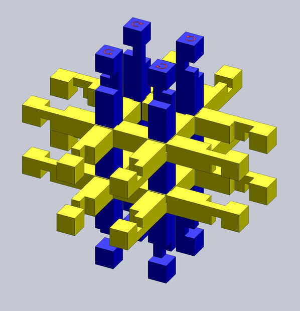 Ahora toma el restante Long1 y bloqueo en la capa inferior de modo son ensamblados como en la foto. NOTA Tenga cuidado que tienes que girar otra vez la capa Long2 (azul) para bloquear a la segunda y para ello tienes que girar a la vez siempre a de la Long2. Asegúrese de que la ya bloqueada caigan hacia fuera (que es lo complicado de montar ;)