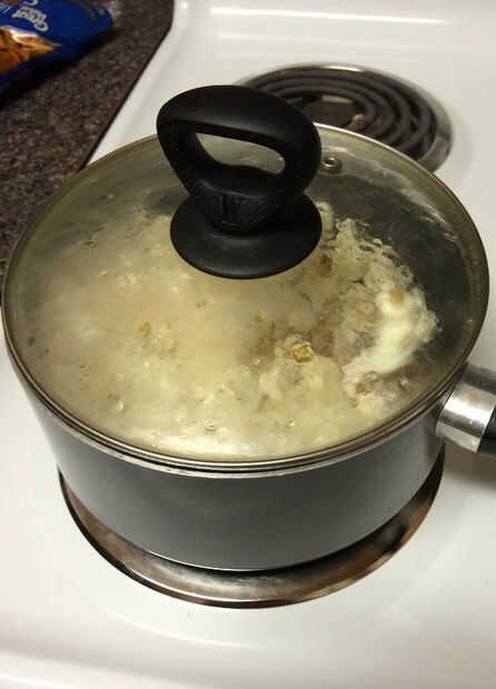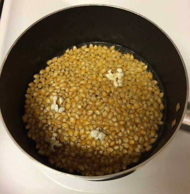 Añadir los granos de maíz a la olla y continuar calentar la olla. Coloque la tapa sobre la olla y revolver de vez en cuando los granos hasta que las palomitas de maíz en su mayoría ya haya reventado.