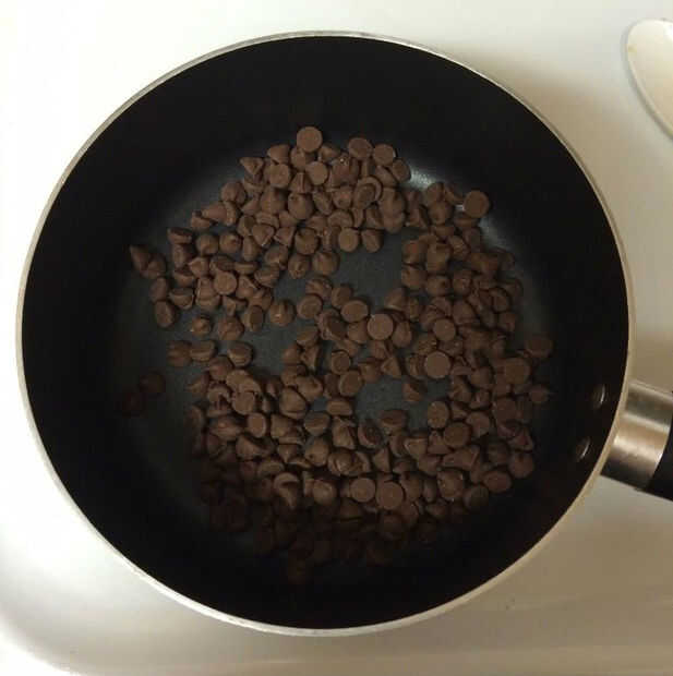 Verter la bolsa de chispas de chocolate en la cacerola. Calentar los chips de chocolate a fuego lento y revolver continuamente hasta que derritan completamente.