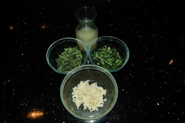 Cantidades dependen de cuánto quiere hacer pero mantener las proporciones de jugo de limón aproximadamente 1/3 2/3 mantequilla. Me gusta un montón de ajo, 4 dientes por cada taza. Empart de hierbas de sabor a la mantequilla tan no más hacerlo.