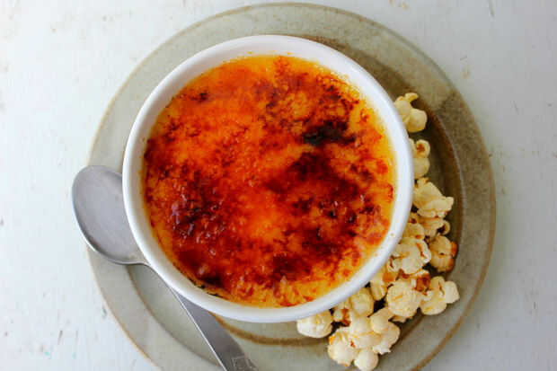 La infusión de crema con sabor a recién hecho estallar, salado, untado con mantequilla palomitas hace un particularmente delicioso Creme brulee. La cuchara grietas a través de la capa de caramelo crujiente en una sedosa crema a continuación. La combinación de palomitas de caramelo y mantequilla hace este gusto como maíz de caramelo. Única forma más sexy.