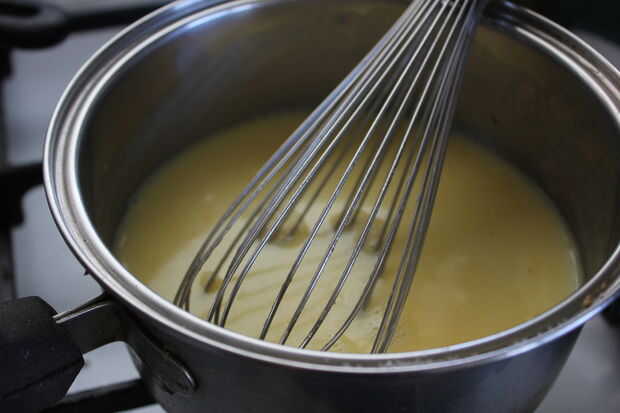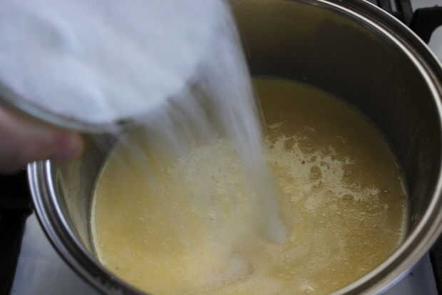 Vierta en una olla mediana el azúcar + sal y llevar a fuego lento. No hierva, sólo desea que la crema se caliente! Probar la mezcla, y y más sal si es necesario. Creo que añadir más sal, más saca ese sabor de teatro de la película.