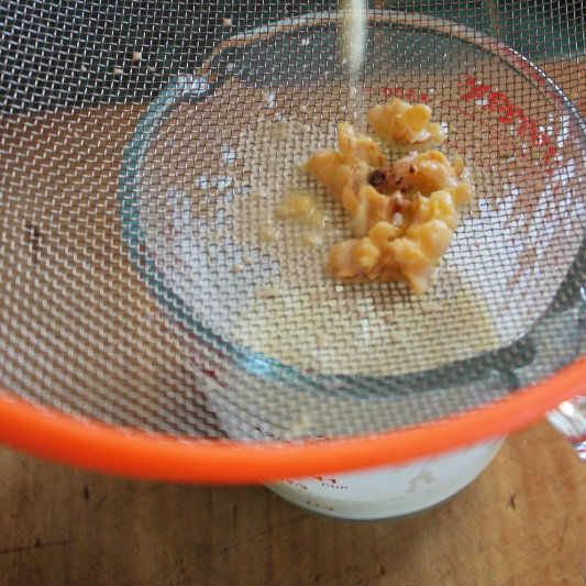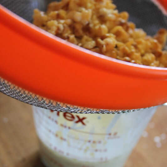 Asegúrese de presionar las palomitas en el colador para exprimir toda la crema. Algunas han sido absorbidas por las palomitas de maíz, sólo tiene que añadir nata como mucho más ya que tiene que medir 2 tazas.