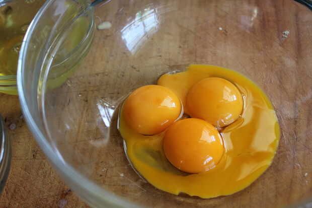Tienen sus yemas de huevo en un cuenco redondo grande y bate a mano.