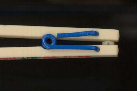 Con la horquilla desmontada, atornillar el tornillo de plástico a través del agujero roscado en un palo, con la cabeza enfrente de la "cara pintada", hasta que la cabeza del tornillo llega casi hasta el palo. Colocar el otro palillo en una superficie plana con su "cara pintada" y la bobina de primavera en que palo había curvado del surco. Coloque la ranura curvada de la palanca con el tornillo de plástico en el muelle en espiral y girar el tornillo de plástico hasta que limitará las puntas de los palillos de abrir más de una pulgada de distancia una vez que finalmente se monta la horquilla. Cortar el la punta sobrante del tornillo y arena suave la punta resultante. Idealmente, la punta del tornillo se va eventualmente empotrada un poco dentro de su palillo.