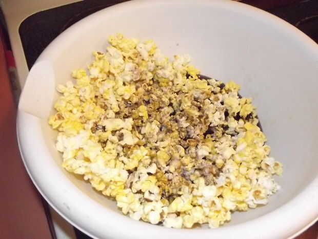 Vierta la mitad de la capa en cada recipientes. Revuelva en la mezcla. Cuando está caliente se derrite las palomitas un poco, pero si esperas demasiado tiempo para que se enfríe, no se pega así. Revolviendo las palomitas mezcla más fácil, pero pueden romper las piezas aparte, así que si revuelve, ser fácil.