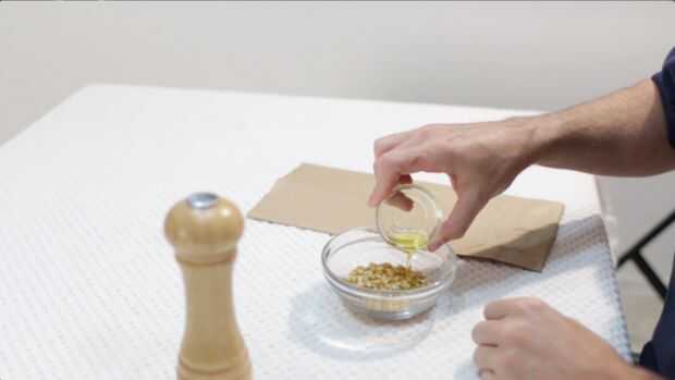 En primer lugar permite poner los granos en un recipiente agregar nuestro aceite de oliva y unos batidos de sal, y revuelva con un tenedor o cuchara. Ahora, aceite no es necesario, los granos aparecerá sin él, pero me gustaría añadir para agregar un toque de sabor.
