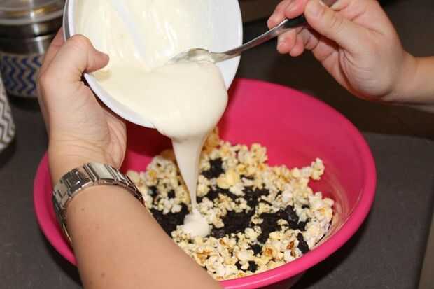 Añadir la corteza de almendra derretida a la mezcla de Oreo y palomitas de maíz
