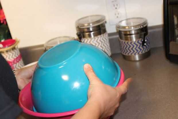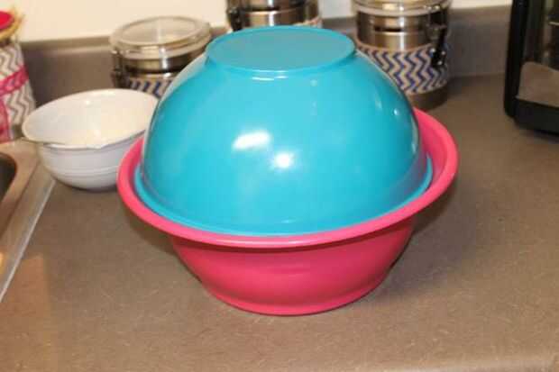 Coloque un bol encima de la otra y luego sacúdalo con cuidado hasta que se mezcle un poco. Ten en cuenta que es fácil para las palomitas a caerse de los tazones de fuente