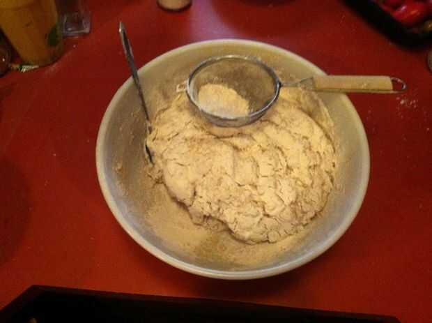 Tamice la harina ligeramente por encima de la bola de masa. Tire de los lados, tamice la harina más hasta que usted puede manejar la pelota sin que se pegue a la taza y sus manos.