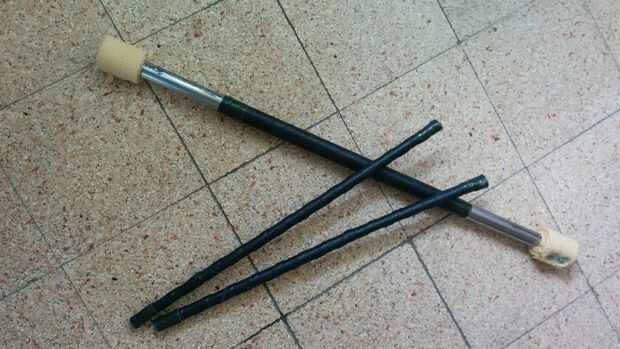 Envolver los palitos con el apretón en una espiral y asegúrese de que está apretado, el palo menor puede ser cubierto a fin pero en el palillo principal deben mantener una distancia segura de los bordes llamas (yo separados 12 cm a cada lado y la cinta tipo de quemado un poco durante mi primer ensayo, no un problema simplemente significa voy a tener que reemplazar más a menudo la cinta). Puede usar las chinchetas para sujetar el extremo de la empuñadura y pegamento para que no resbale (utilizar tachuelas de palos pequeños y cola en la memoria principal). Cinta de los extremos de sus manos para ayudar a prolongar su vida y darle a todo una apariencia más limpia.