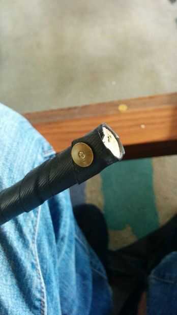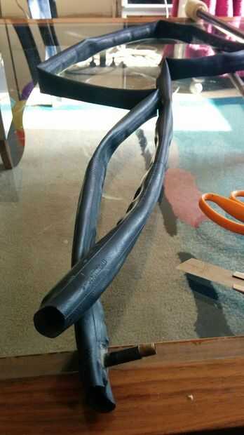 Si no tienes grip de raqueta de tenis de mentira alrededor de la casa, preguntar en cualquier tienda de bicicletas para tubos, una vez estás arruinados que no tienen uso con ellos. Encontré un montón tirado cerca de la basura fuera de una tienda de bicicletas en mi calle, sólo usé uno y tenía material de sobra. Simplemente corte el extremo (la parte donde entra aire), corte a lo largo del tubo, ábralo y lávelo. Si le parece a amplia (como el mío), solo corte a lo largo de él otra vez y una tira en dos.