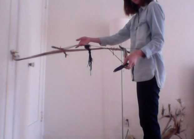Hacer y tocar un berimbau (instrumento de arco de música brasileña) en un camping