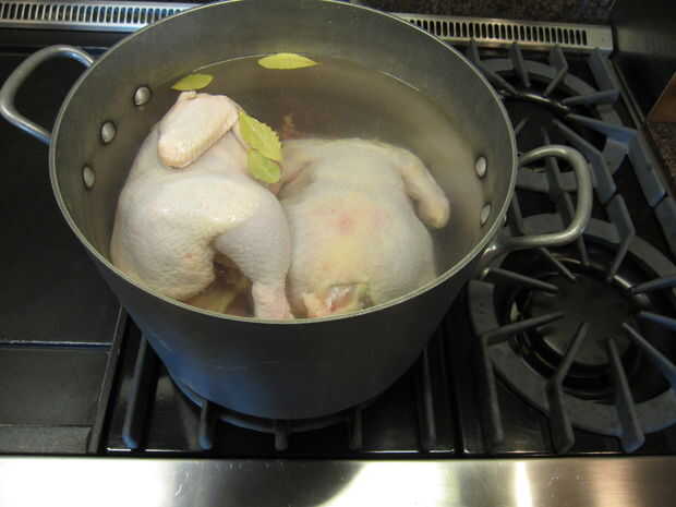 Necesitará el pote grande y dos pollos para este paso.   Poner dos pollos en el bote y totalmente sumergirse en el agua, luego poner la olla en la estufa y prendieron el fuego a fuego medio.  Deje que los pollos a hervir durante 3 horas o hasta que los pollos estén completamente cocidos y la carne se caiga de los huesos.