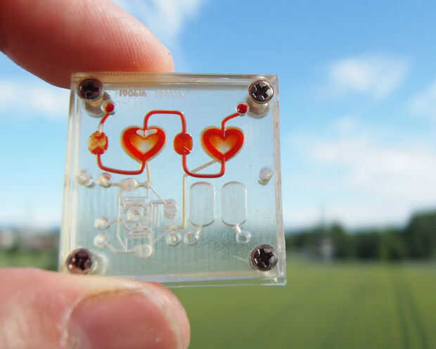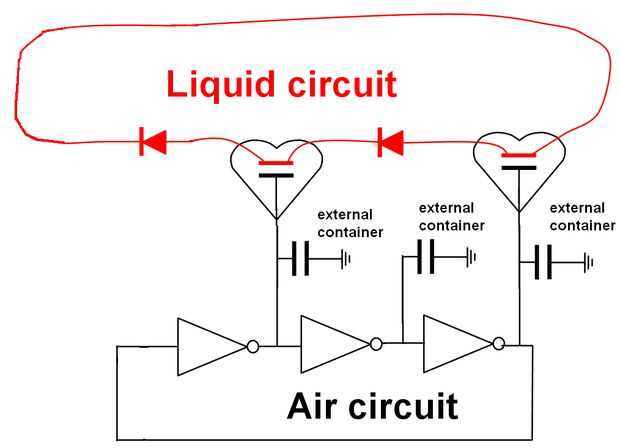 En todo caso lo trabaja en el mismo principiocomo unVerdadero corazón. Expanden y contraen dos cámaras de líquido de push (en forma de corazón) a través de válvulas unidireccionales, estableciendo un flujo direccional en lugar de sólo oscilatorio movimiento del fluido. El "latido del corazón" es generado por un oscilador de anillo fluídico que como contraparte electrónica consta de 3 circuitos inversor neumático conectados en un bucle. Todo el circuito es alimentado por aire comprimido o vacío, que viene conectando una bomba de vacío externa o compresor a uno de los agujeros en el chip. En una versión más avanzada (con consumo de aire reducido) un cartucho pequeño 8 g CO2 debe ser capaz de mantener el bombeo de varias decenas de minutos, pero tengo aún no logró mantener el consumo de aire tan bajo y por el momento va a necesitar una bomba de vacío pequeña externa para que funcione continuamente. Como un vacío silencioso portátil "alimentación" por el momento utilizo dos jeringas de 60 ml, conectadas entre sí. Una jeringa actúa como un pistón de una bomba de vacío de mano y el otro como una cámara de vacío. Pensar como una "batería de aire recargable de mano".