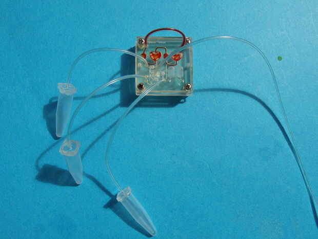 Para ver mejor que el corazón vencer también por supuesto debe llenar la parte fluídica del circuito con tinta. Un líquido coloreado debe ser inyectado en el orificio superior derecho con una jeringa. La bomba entonces impulsa el fluido hacia la izquierda para que el líquido bombeado salga del hoyo izquierdo. La dirección bombea es fijada por los diodos y no puede ser invertida. También debe conectar un tubo en el orificio de salida superior izquierda para que inyecta o fluido bombeado se recogerán dentro del tubo. Una vez que se ha inyectado el líquido debe también conectas el extremo abierto del tubo lleno del líquido en el puerto de entrada de fluido para que el líquido se bombea alrededor del circuito (ver el vídeo en la introducción).