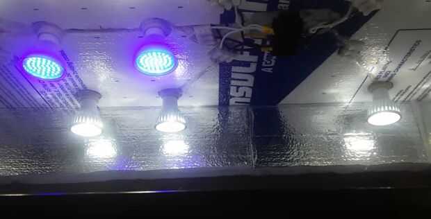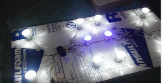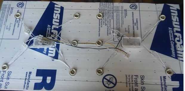 Tomé un pedazo de espuma de poliestireno y recortados a pequeños círculos para que pudiera silicona conector de la base en entonces cableado arboledas poco juntos y hechos todo para mantener los cables en su lugar. Yo 10 caída de 9wt LED blanco por bulbos y 4 azul LED colgando luces y funcionó una cadena de LED rojo de esquina a esquina las enganchadas y gran trabajan me pintaron la espuma de poliestireno negro y añaden las paredes de apoyo.