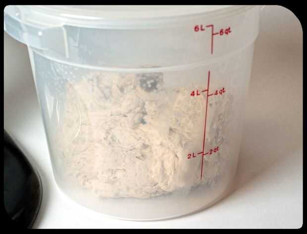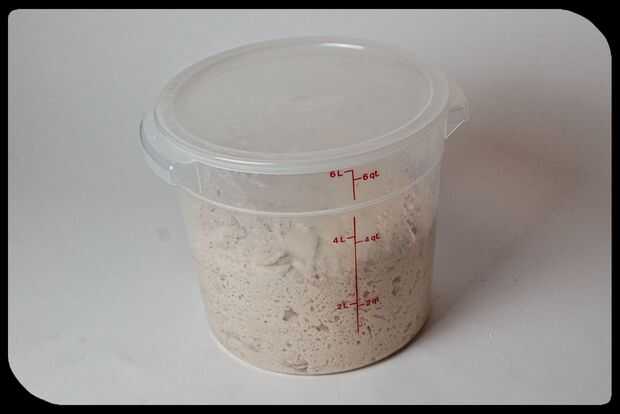 Mezclar la harina, sal, agua y levadura en la batidora hasta bien incorporado. Esta receta es para una masa floja, por lo que debe ser un poco pegajosa. Después de mezclar, coloque la masa en un recipiente no hermético. Hago estas tomando un cubo grande de alimentos seguros y perforación 5 agujeritos en el centro de la tapa como se muestra en la imagen. Esto permite aire en, pero mantiene el recipiente firmemente bastante que la masa no tome los olores de la nevera. Deje que la sit de la masa durante 2-4 horas hasta que doble de tamaño y comienza a disminuir hacia abajo.