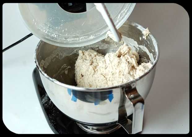 Para evitar harina que sopla por todas partes cuando yo ejecuto mi batidora, tomé una de las tapas de plástico para el bol y corte un orificio circular en lo suficientemente grande para que el movimiento orbital de la mezcladora. Recomiendo hacer esto para que limpiar mucho más fácil.