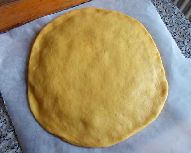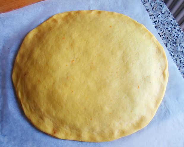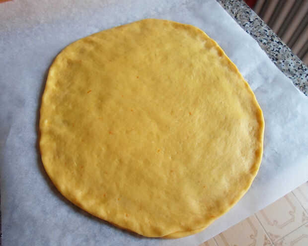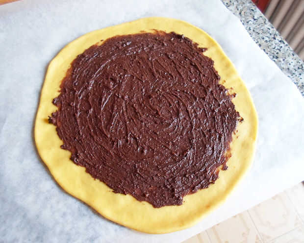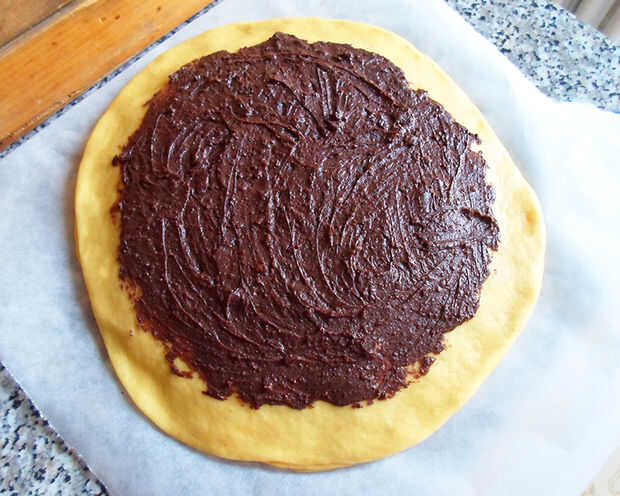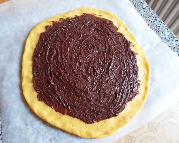 Ahora difundir alguna otra crema de chocolate en el segundo disco (siempre dejando un borde libre), agregue el tercer disco y cierre con los dedos.