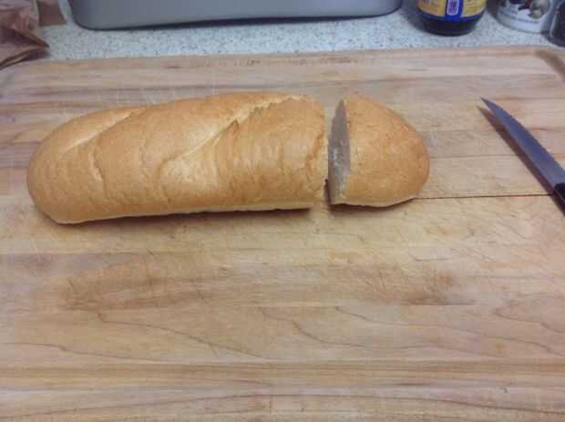 Elegir un lado cortar, cortar y guardar el trozo de pan (que podría comer más tarde!). Entonces mover el cuchillo hacia adelante y hacia atrás de espalda al frente en un círculo.