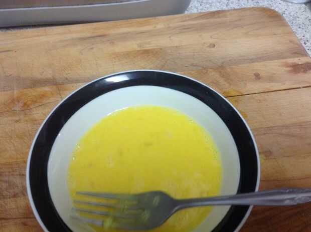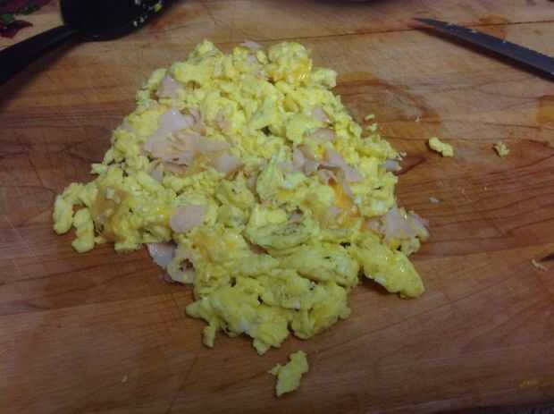 Hacer huevos revueltos como normal, pero una vez que estén casi hechas, añadir la pechuga de pavo, o jamón si eligió y cocinar con los huevos. Añada el queso. Una vez que el queso se derrita, luego tomar el brebaje todo hacia fuera y en el tablero de corte de.