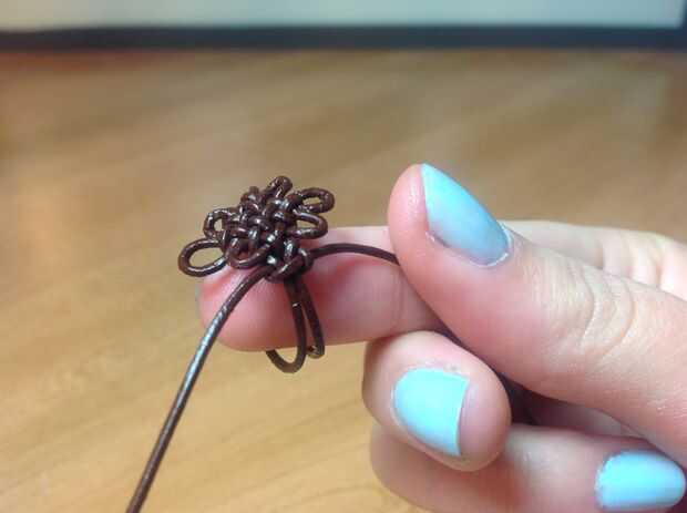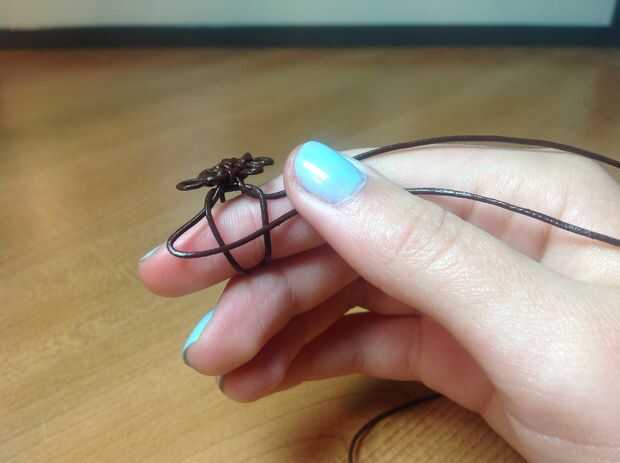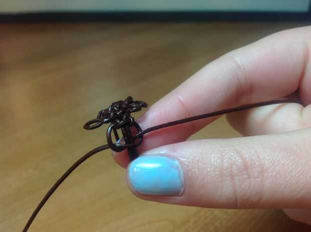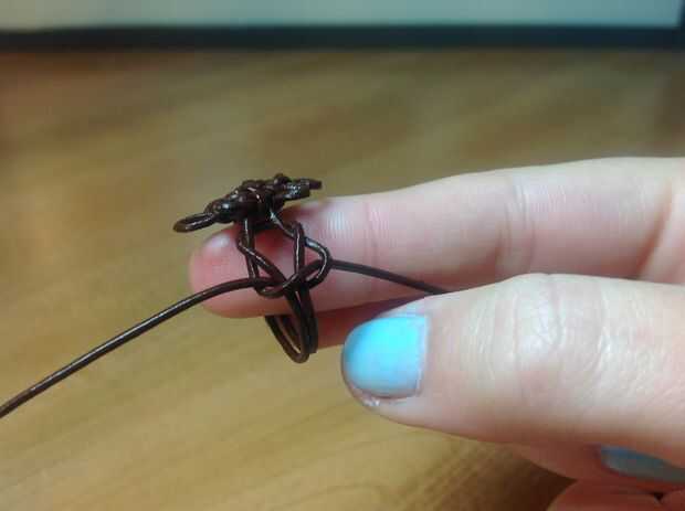 Envuelva el lazo alrededor para que el medio toca la base del anillo y el hilo de ambos extremos de la cadena hacia abajo pensada el lazo para que se peguen hacia fuera en ambos lados en la parte inferior. Tomar el lado izquierdo y envuelva un bucle sobre el bucle. Tomar la derecha y diríjase alrededor de la cuerda izquierda y en el lazo. Endurecer para que toque la base. Ahora toma la derecha y pasar las dos cadenas en el medio. Tomar el lado izquierdo y sobre la cadena y debajo de las dos cadenas en el medio y sobre las dos cadenas a la derecha. (Esto es al revés de lo que hicimos la primera vez)