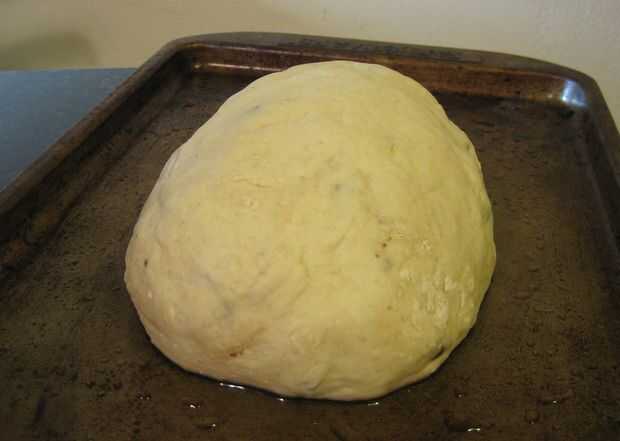2. Engrasar la bandeja para hornear ligeramente y coloque la masa sobre ella, formando suavemente en un pan ovalado (si prefieres panes en forma de pan en lugar de libre-forma, puede utilizar un molde de pan en lugar de otro)