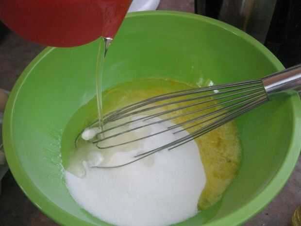 En un bol grande, batir los huevos ligeramente. Luego añadir el aceite, el azúcar y la vainilla y mezclar.