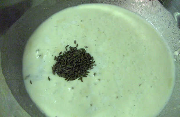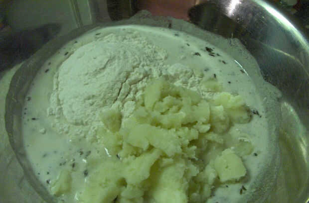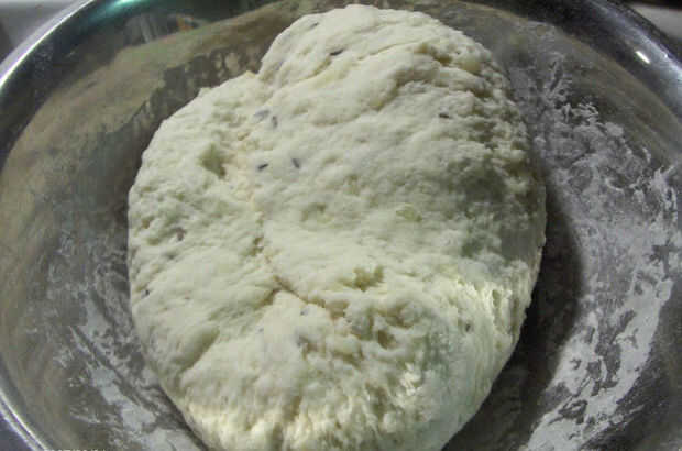 Agregue el restante de 3/4 taza de agua, sal, semillas de alcaravea. Gradualmente agregue la harina y el puré de patatas. Amasar unos 10 minutos.