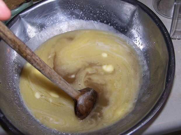 Mientras esperas para que activar la levadura, vierta el agua caliente en un tazón grande. Añadir la mantequilla y la miel y mezclar. La receta original pedía sal aquí también, pero no dijo cuánto. Lo dejé hacia fuera, y nada parecía mal. Sólo mezclar todos juntos. Una vez que la levadura, añadir a la mezcla, junto con el agua que usaste para activarlo.