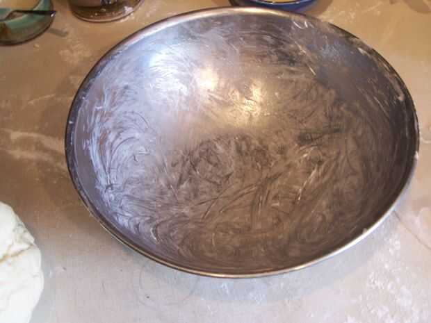 Su tazón de fuente grande de lavado y engrase bien. Flop la masa se amasa todo en el recipiente hasta que bien untada de. Cubrir con un paño húmedo y déjela subir en un lugar cálido. Si su habitación está demasiado fría, poner el pan en el sobre con una cacerola de agua caliente debajo.