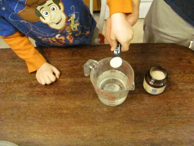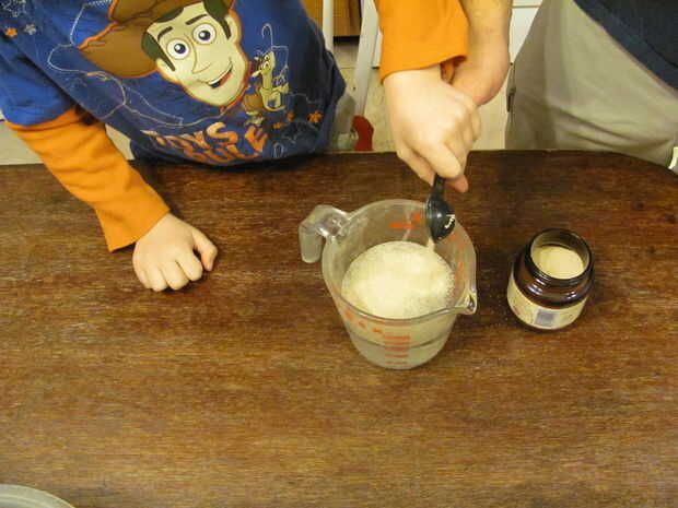 ¿Recuerda las pequeñas criaturas que aman hacer gas? No, no su tío Alfred. Levadura! Bueno, para ellos hacer su trabajo necesitan calentar el agua. Sólo no hervir el agua, o matará. Agua tibia del grifo es un montón lo suficientemente caliente como para hacer el trabajo. Mezclar el agua y la levadura y reservamos para activar.