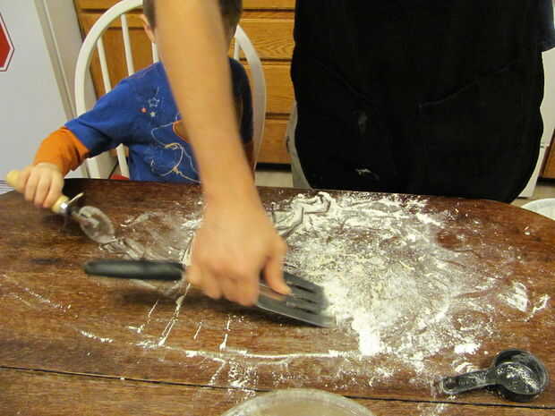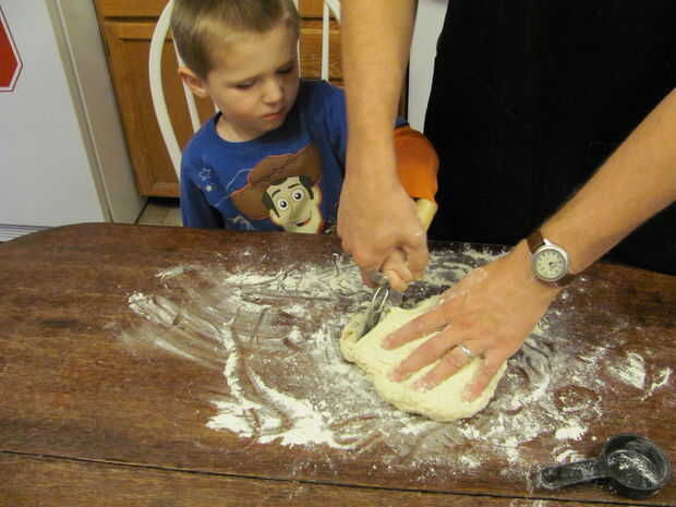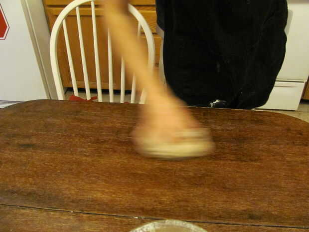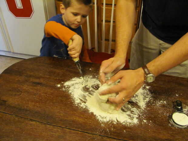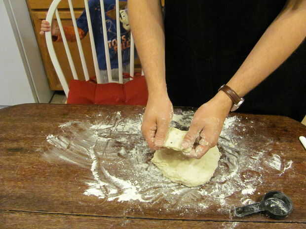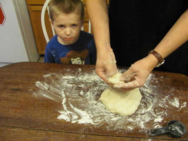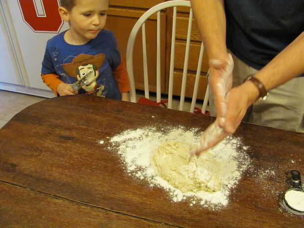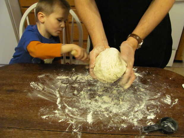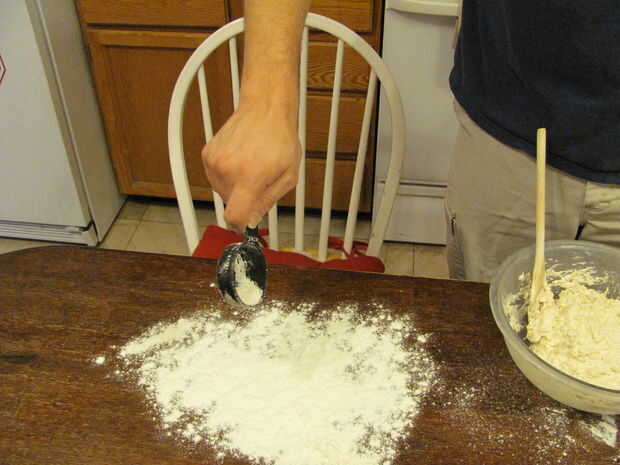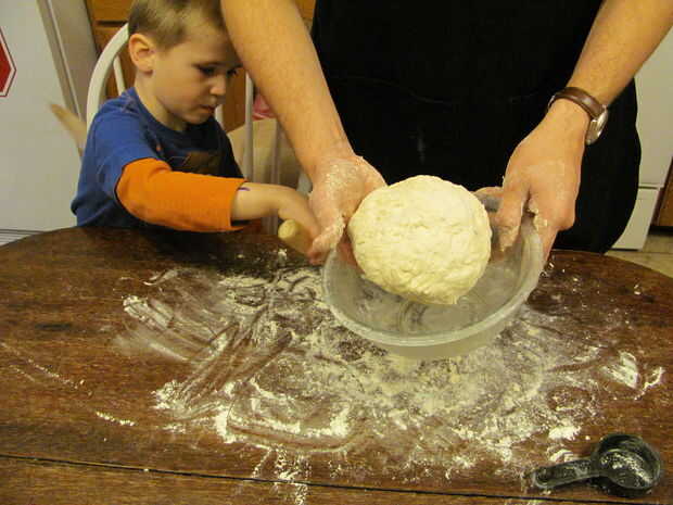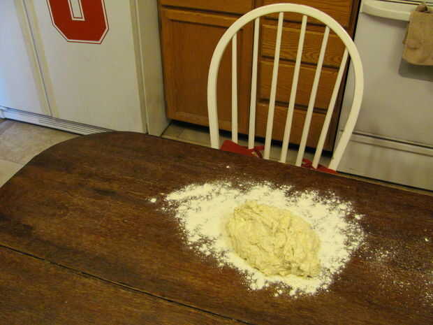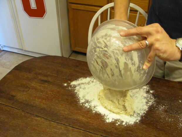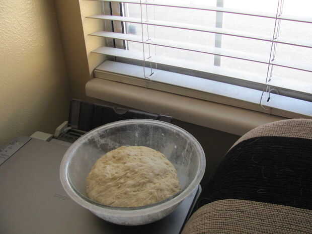 Tomar una taza de 1/4 de harina y el polvo sobre la mesa. Llene nuevamente la taza de medición y luego agarrar la bola de masa. Smoosh plana en la harina, doblar a la mitad y smoosh otra vez. Añadir harina Si es pegajosa. Amasa y amasa hasta que pase la prueba del windowpane. Una vez que está amasada, poner en un tazón engrasado, cubra con una toalla y ponerla en un lugar cálido. Comencé en mi ventana, pero no caliente suficiente así que ponerlo junto a mi aire y levantó la temperatura a 72. Debe duplicar en tamaño, a menos que no hayas amasado suficiente o mató a nuestros amigos de levadura.