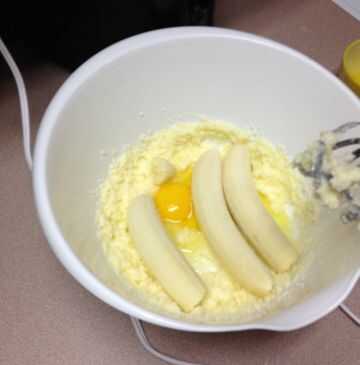Romper dos huevos y colocarlos en el recipiente con 3 pequeños plátanos pelados. Utilizar la batidora de mano para mezclar la masa con una consistencia uniforme.
