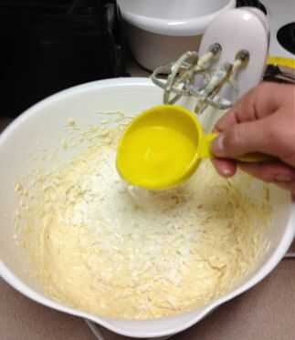 Con un mezclador de mano, mezclar el coco y el agua a la masa hasta que se alcanza una consistencia uniforme y se distribuyen uniformemente las escamas de coco.