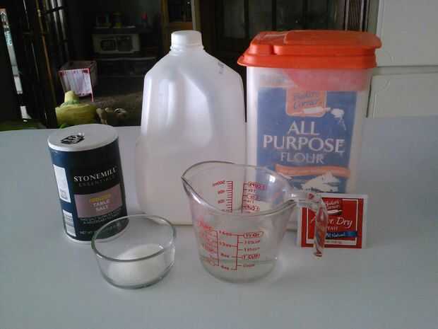 Para el panT 65 harina 1 kg14 g de sal por kg de harina600 ml de agua tibia2 paquetes de levadura fresca para panLa imposibilidad de tener levadura casera (protector de una pequeña masa de amasado anterior, para fermentar la mezcla siguiente) puede s
