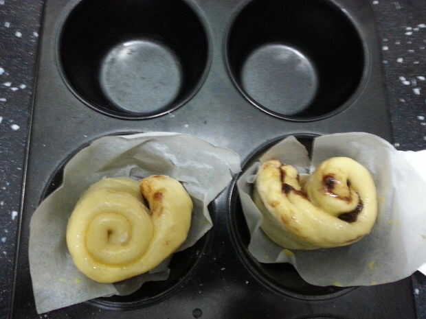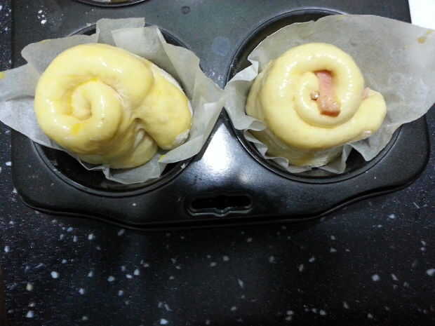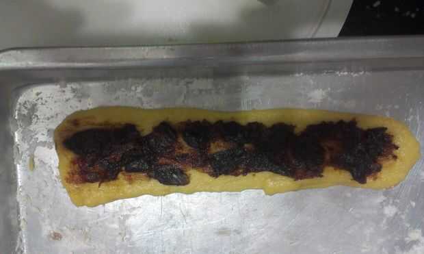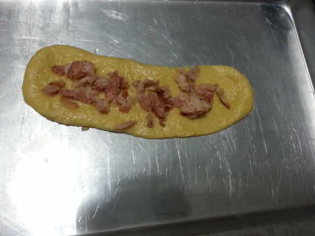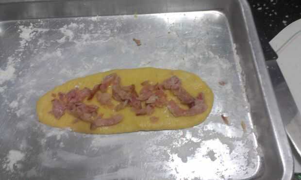 3. Extienda el relleno (cantidad a gusto). Utilizamos tiras de pollo ahumado para el rolls salados y fecha mermelada (receta casera, venir) para el pan dulce.