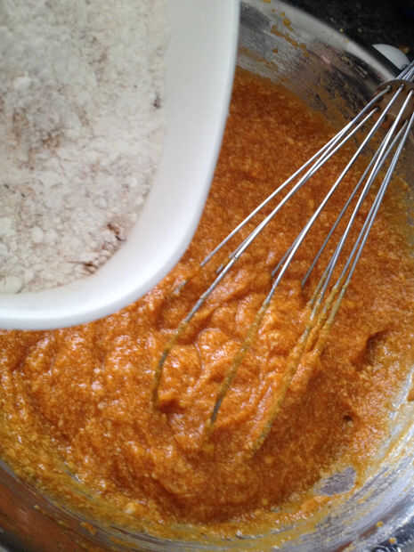 En otro recipiente, usando un batidor de alambre, combinar el huevo, azúcar, margarina y calabaza