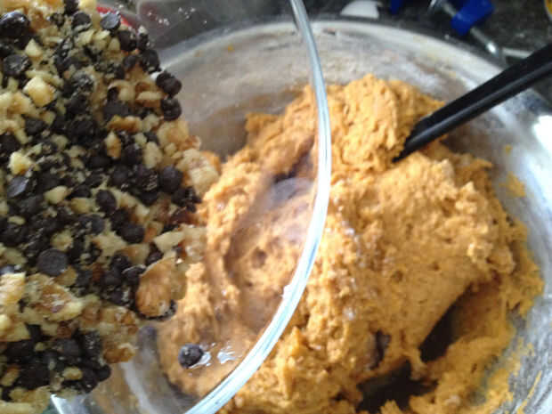 Agregue los ingredientes secos con chispas de chocolate y la mezcla de nuez