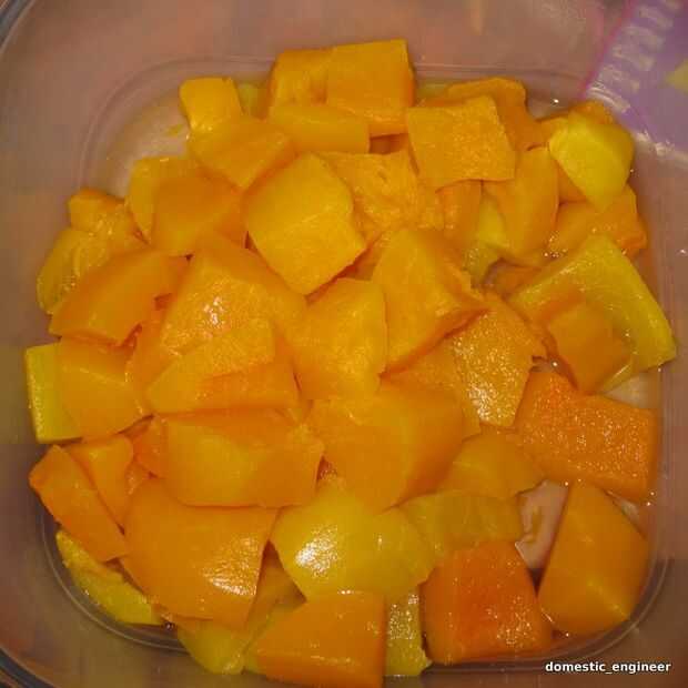 También puede poner todo el horno, o cortar por la mitad y sacar las semillas. Luego cocinar hasta que esté tierna. Si cocinas todo, cuando esté hecho, cortar por la mitad y quitar las semillas con una cuchara. Entonces usted puede sacar la carne.