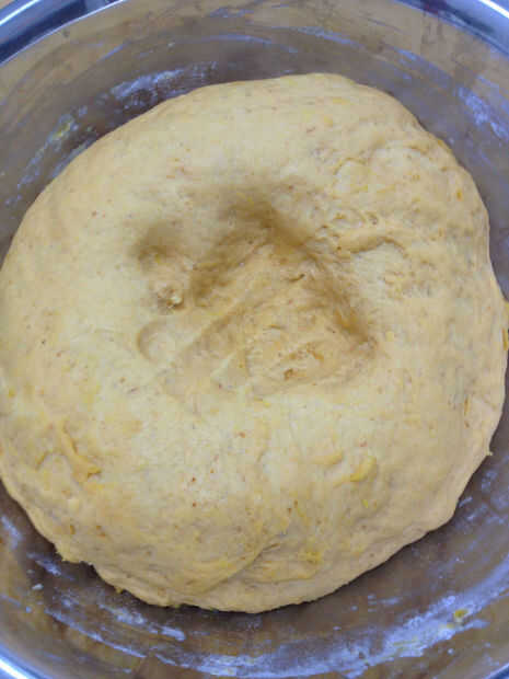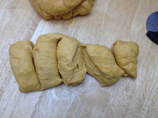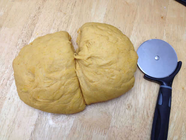 Golpear la masa, amasar un poco y dividir en dos porciones. Cortar cada porción para hacer panes de 10
