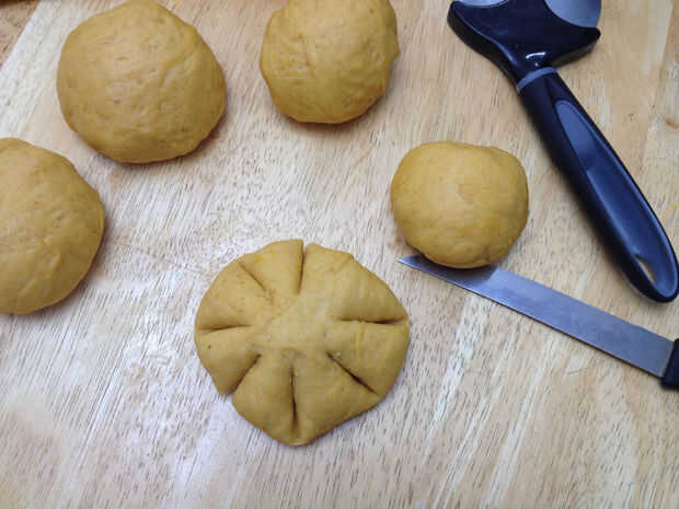Forma cada masa en una bola y con un cuchillo, corte como se muestra en la imagen