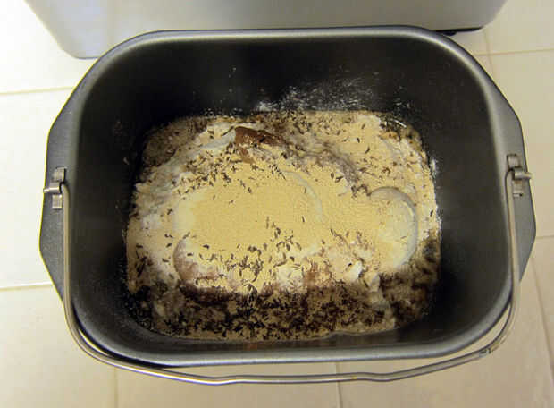 Una vez que tengas todo lo mide hacia fuera y en la cámara de cocción (que es lo que llama en mi manual Cuisinart) sólo insertarlo en la máquina de pan. Inicie la máquina de pan, esto es una masa muy densa por lo que será ruidoso cuando se mezcla.
