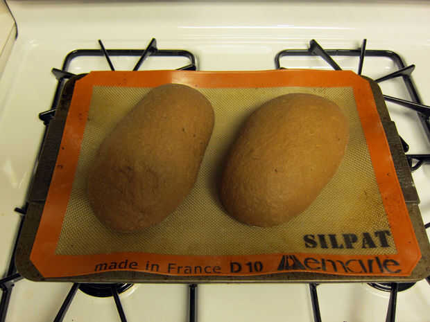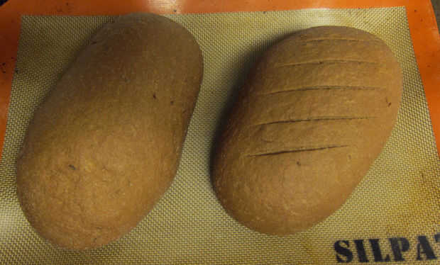 Con un cuchillo afilado, cortar la parte superior de los panes (esto permitirá que escape el vapor). No creo que esto es necesario con un pan pesado como el pumpernickel pero si te gusta el look para el pan terminado siga adelante.